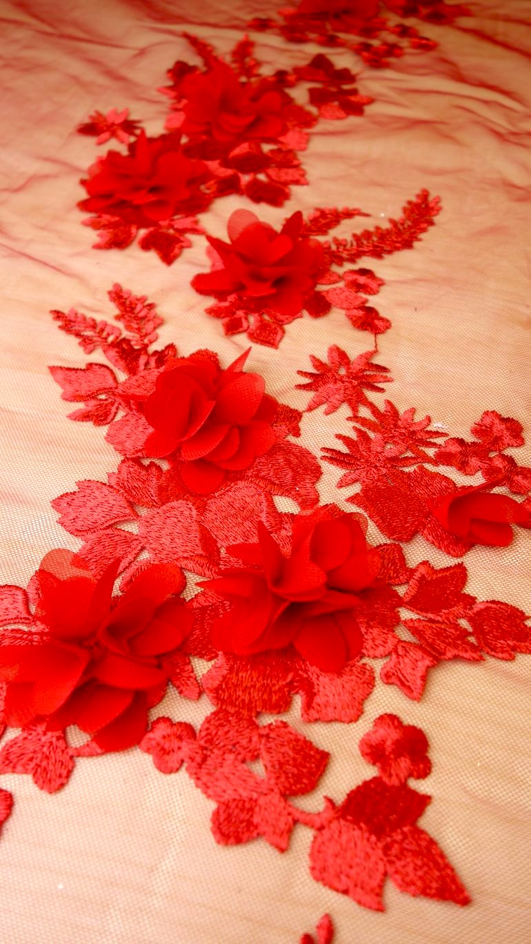 Gyönyörű mintázatú, különleges 3d-s csipke. Mindkét szélén rendelkezik bordűrrel, a mintázata pedig lefolyó motívumok. A 3d-is virágszirmok muszlin anyagból vannak, amik, ha nincs valahol rá szükség, könnyedén lebonthatóak. A motívumok a tüll alapanyagból kivághatóak. Tökéletes választás menyecske, alkalmi ruhák, táncruhák, dekorációk, fátylak alapanyagaként.